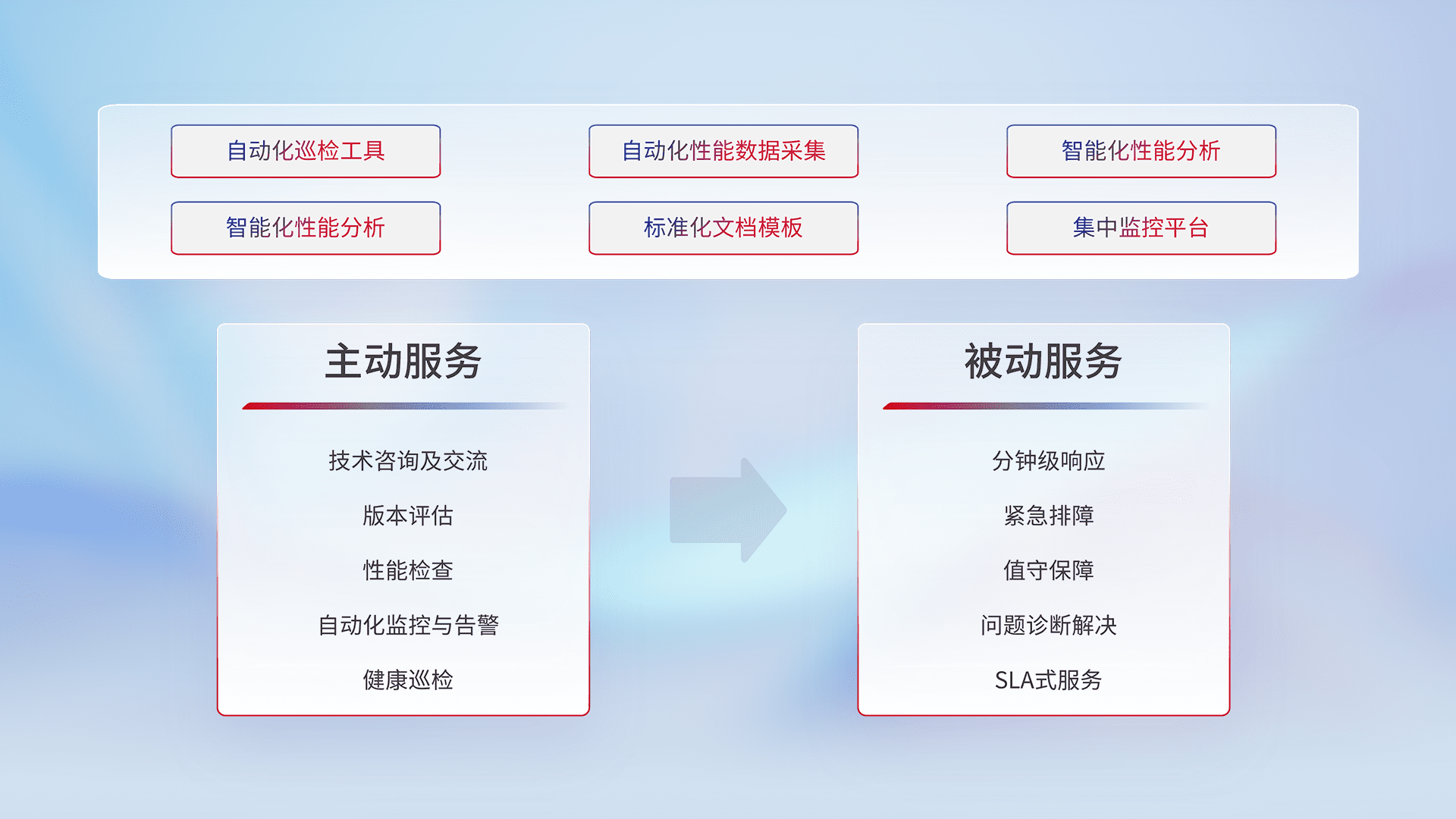 智能化工具和标准化文档,,,,保障服务质量,,提供主动服务(包含技术咨询、、版本评估、、、、性能检查、、、、自动化监控与告警、、、健康巡检)和被动服务包含(分钟级响应、、、紧急排障、、、值守保障、、、、问题诊断解决、、SLA服务)。。。